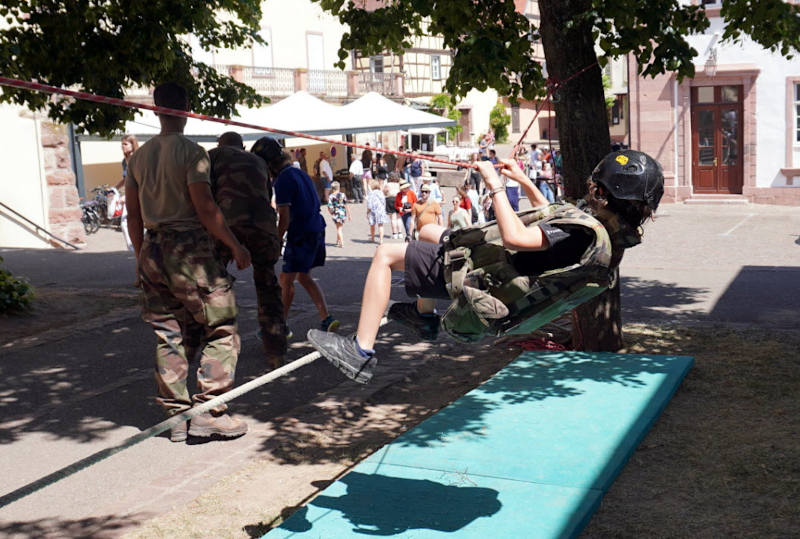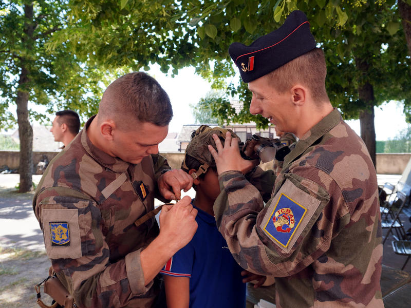 Tout était en place depuis 11 heures afin d’accueillir les villageois, les touristes et les enfants pour leur proposer trois activités : un stand d’armement léger et moyen équipant une section de combat, un parcours d’obstacles destinés aux enfants et une activité de vision nocturne sous tente occultée afin de pouvoir évaluer la capacité des matériels de nuit. Comme d’habitude, les enfants s’en sont donné à cœur joie ainsi que les touristes avec beaucoup d’humour.