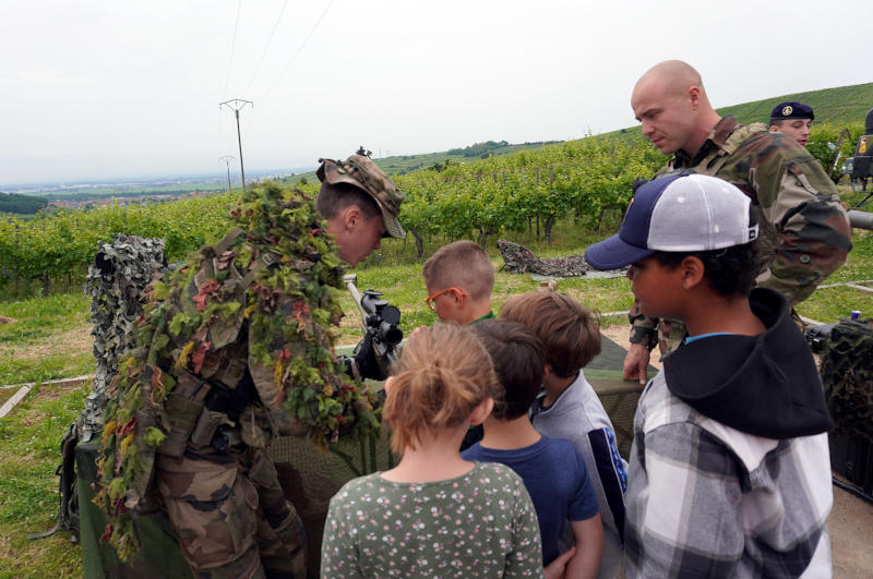 La journée a commencé par la présentation des matériels de la compagnie aux écoliers. « Lorsque la mairie m’a prévenue, j’ai préparé les enfants à cette rencontre avec les militaires. Ils ont tout de suite manifesté leur curiosité. Il s’agit principalement des CP au CM2. La maternelle nous rejoindra pour la prise d’armes » a annoncé la professeure des écoles.