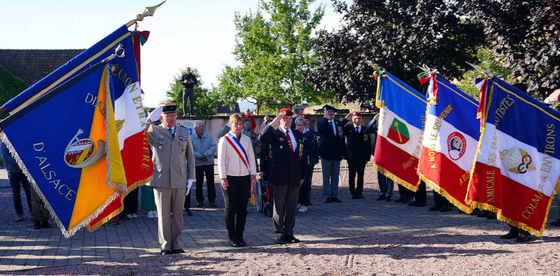 À 10 heures, les festivités ont commencé à Bergheim. C’est dans ce petit village que le 1er RCP avait installé son poste de commandement lors des combats de la Poche de Colmar. Louis Thum président de l’amicale des parachutistes de Colmar a rappelé que la stèle a été dressée, il y a plus de vingt ans, en mémoire des tués au combat du glorieux régiment. En compagnie d’Élisabeth Schneider, maire de Bergheim, il a déposé une gerbe au pied de la stèle.