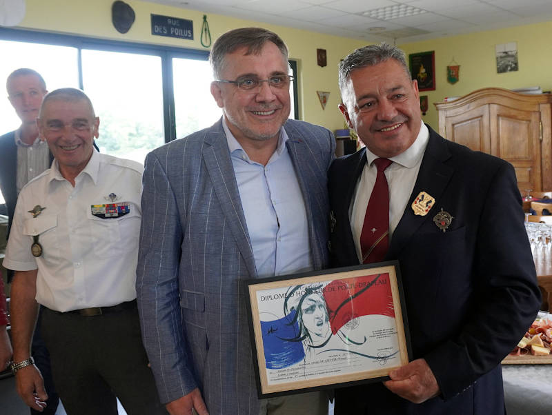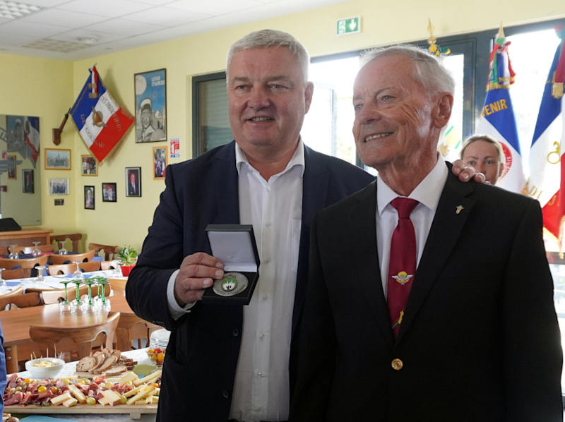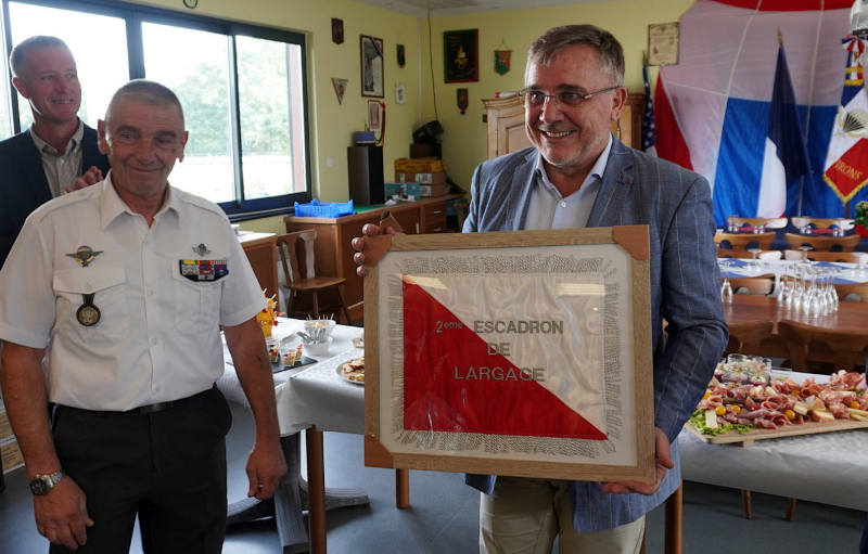Thierry Queffélec, a reçu ensuite une reproduction du fanion du 2e escadron de largage du Régiment de Livraison par Air, unité qu’il a commandée dans les années quatre-vingt-dix avant d’intégrer le corps préfectoral. Eric Straumann, appelé du contingent dans les années quatre-vingts au 2e escadron du 13e régiment de dragons parachutistes, a reçu une médaille aux armes de ce prestigieux régiment des mains du secrétaire de l’amicale.